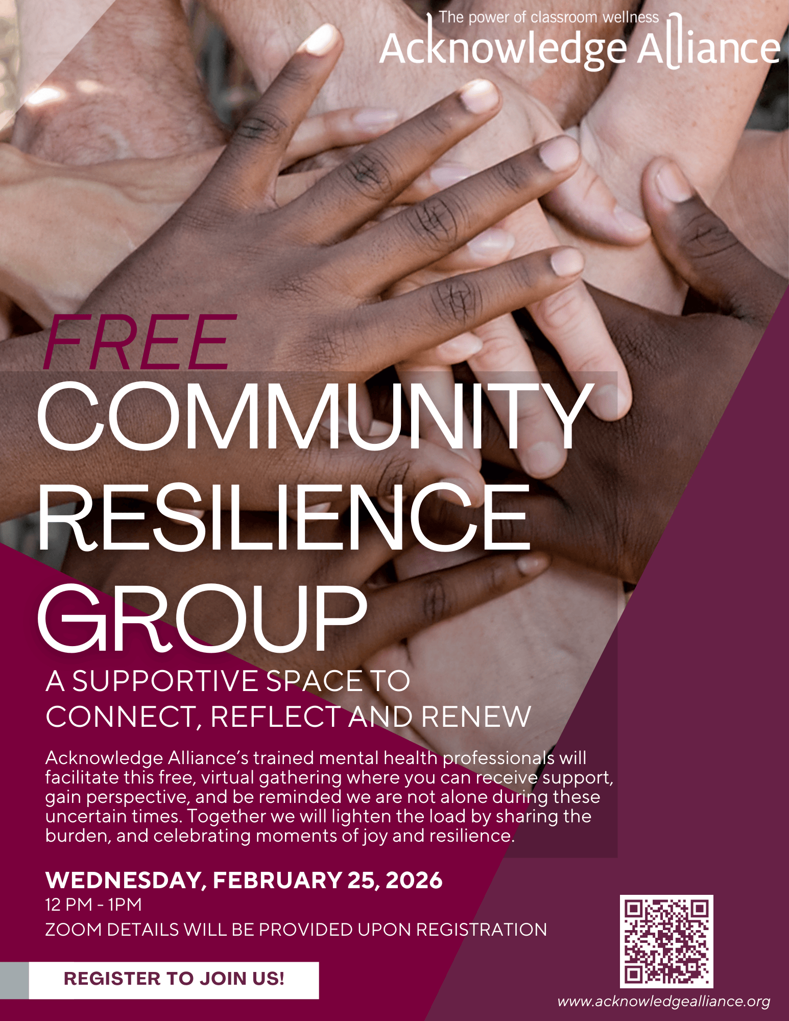 Feb 25 12:00 PM12:00 FREE Community Resilience Group Wednesday, February 25, 2026 12:00 PM 1:00 PM 12:00 13:00 Google Calendar ICS View Event →
